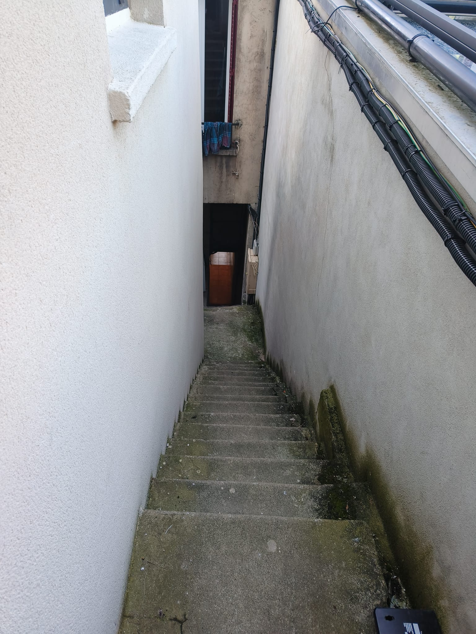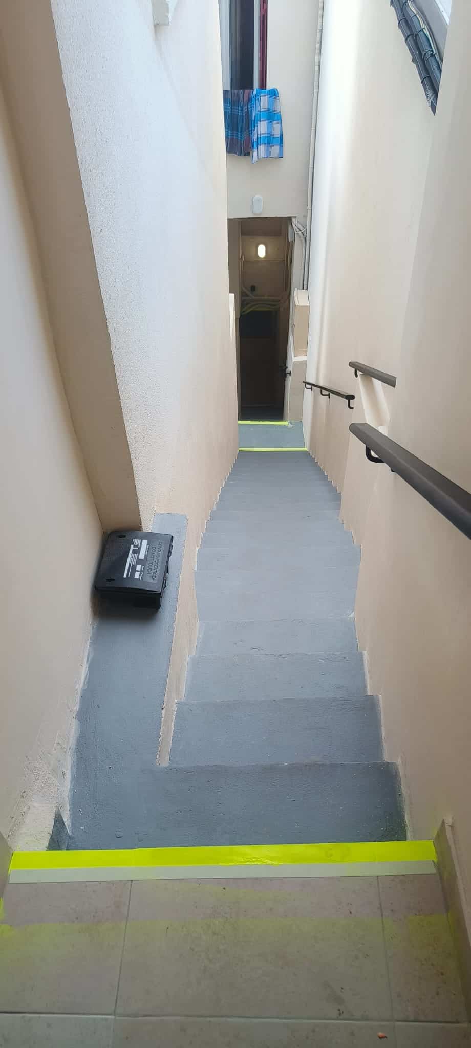 Premièrement, examinons l’image avant les travaux : il est facile de voir à quel point l’escalier de cette résidence était marqué par le temps. En effet, on remarque alors que le béton, abîmé et fissuré, ainsi que la peinture complètement ternie, révélaient l’usure du quotidien. De plus, au-delà de l’aspect visuel, cet escalier représentait un danger, car en mauvais état, il pouvait provoquer des chutes ou des glissades.